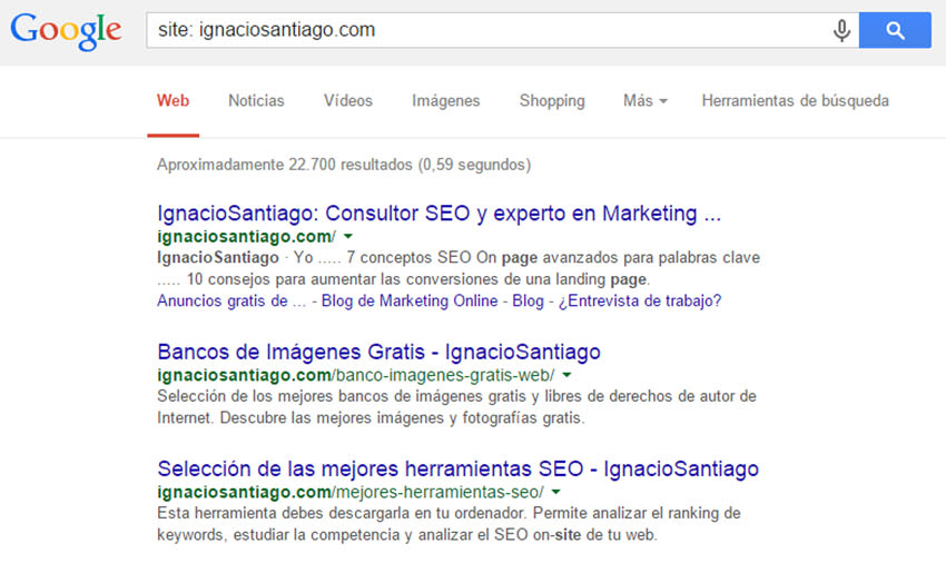 Una opción muy útil es la de adaptar los resultados de búsqueda para una página web determinada. Si usas en comando site: y le añades tu dirección web (sin el http://) estás pidiendo a Google que muestre las páginas que tiene tu sitio web.