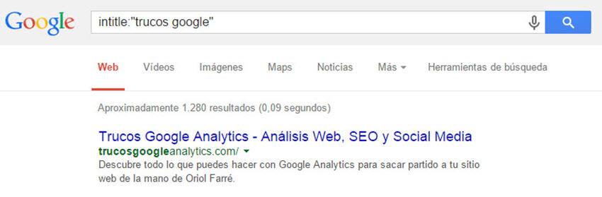 La búsqueda con el parámetro intitle: te perimte buscar las páginas que tengan dicho texto en su título(texto que aparece en la barra de título del navegador). Si buscas “intitle:”trucos google” obtendrás como resultado páginas web que tengan en su título “trucos google“, sin variaciones (al usar comillas queremos que salgan esos términos exactos)