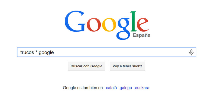 Podemos usar el asterisco en palabras o frases para indicar comodines de una o más palabras. En el ejemplo he utilizado “trucos * google“, que hará que Google busque página con ese término, pero también “trucos perfecto de google“, “trucos avanzados de google“, etc.