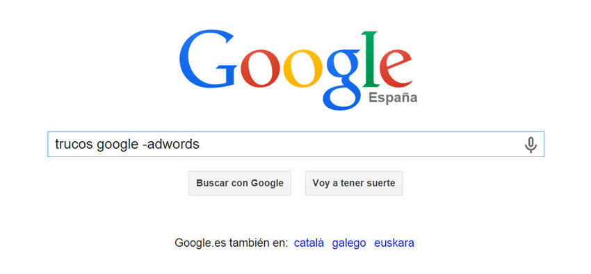 Puede ocurrir que, al realizar la búsqueda de “trucos google“, no quieras que salgan páginas donde se hable de “trucos de google de adwords“. En este caso, restaremos la palabra “adwords” colocando un guión (signo menos) antes de la misma, lo que mostrará las páginas de “trucos google” que no contengan la palabra “adwords“.